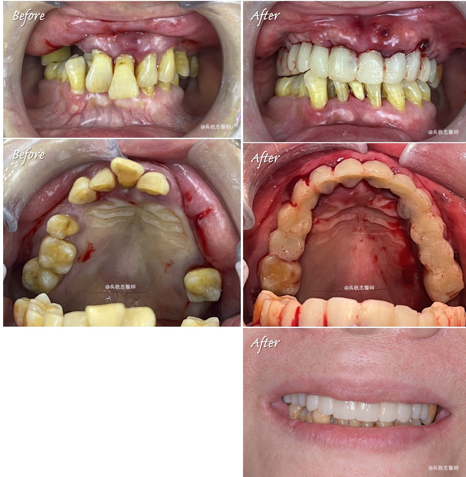 經過完整的口腔評估後,我們建議保留左上後牙(26),其餘牙齒拔除後,進行全口植牙重建。
