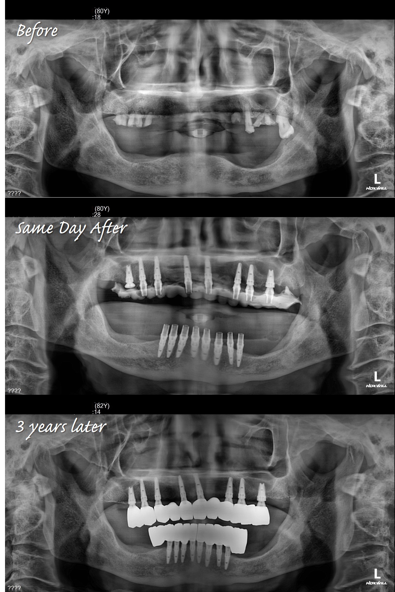 我剛開始接觸一鑽植牙系統不久,就有幸觀摩到陳博士與本診所負責人鄭醫師,攜手完成的一例全口重建手術。這位年逾八十的老先生,在子女的鼓勵下,終於下定決心接受一次到位的全口植牙手術。