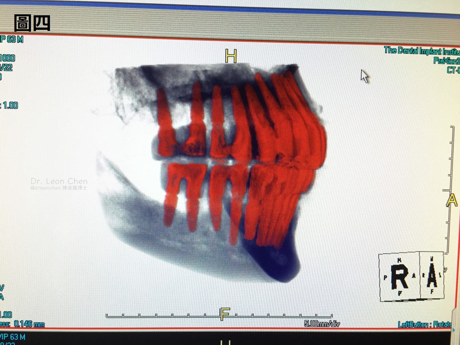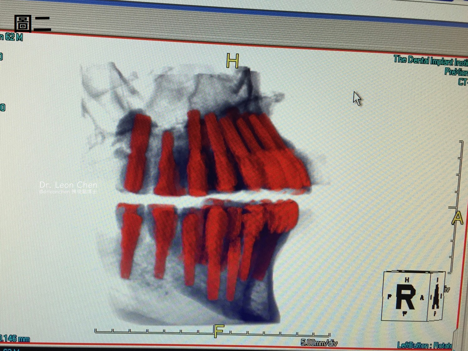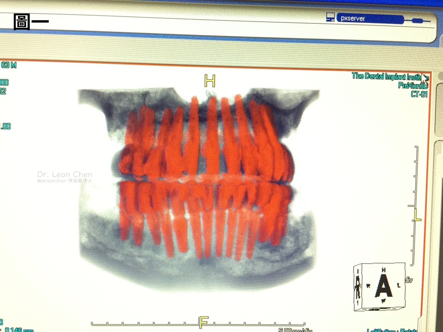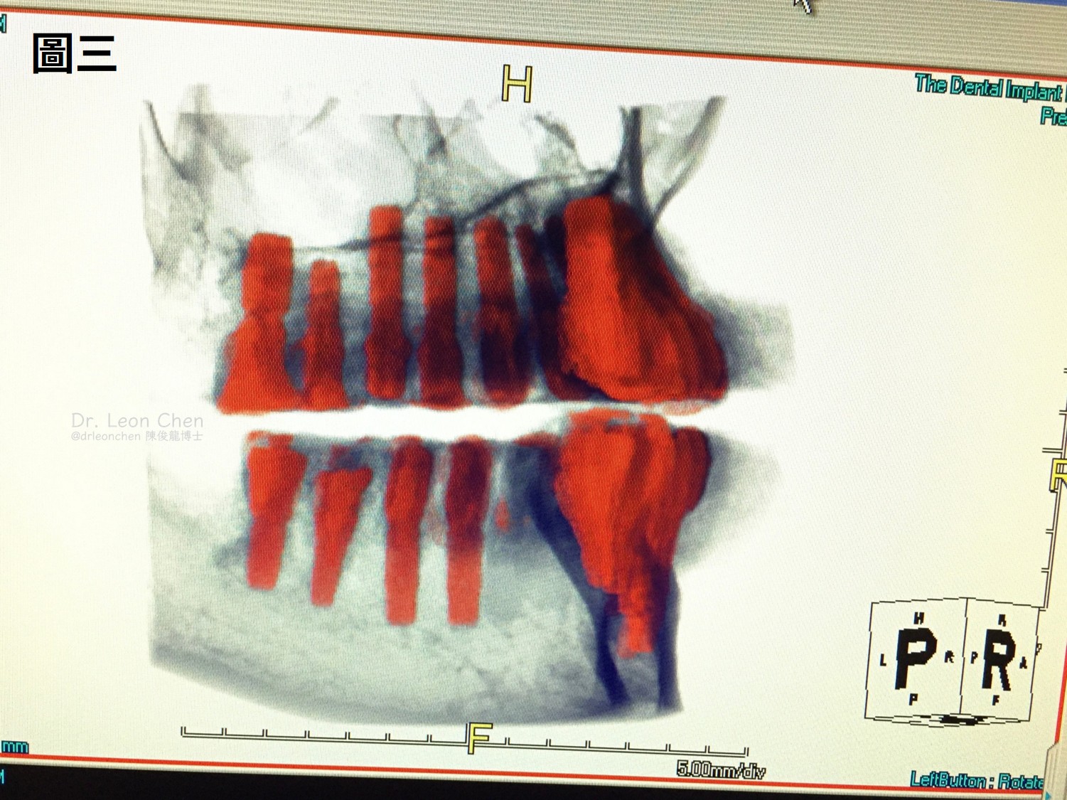 陳博士為患者拍了一張斷層掃描(圖一),特別強調的就是「植體角度」。