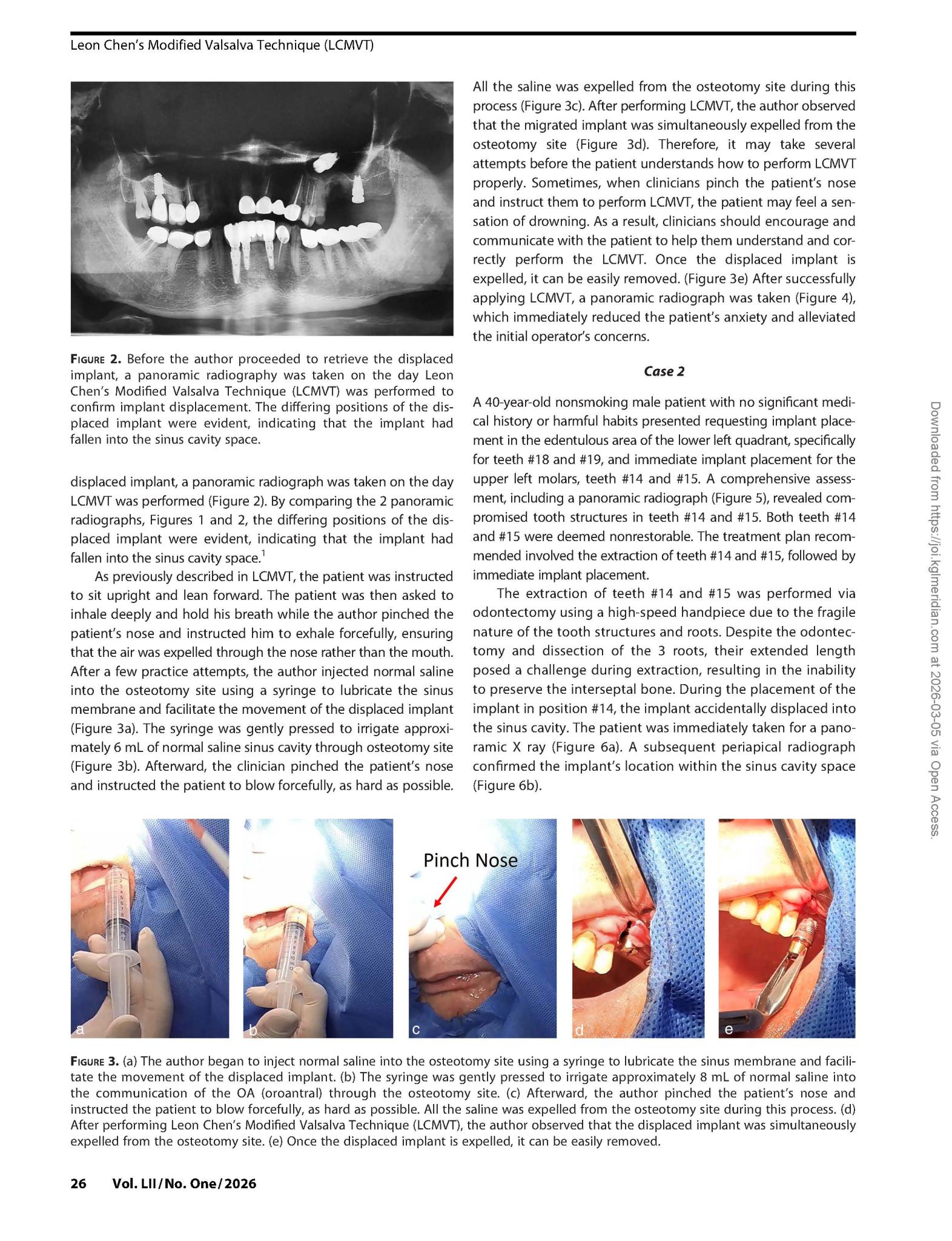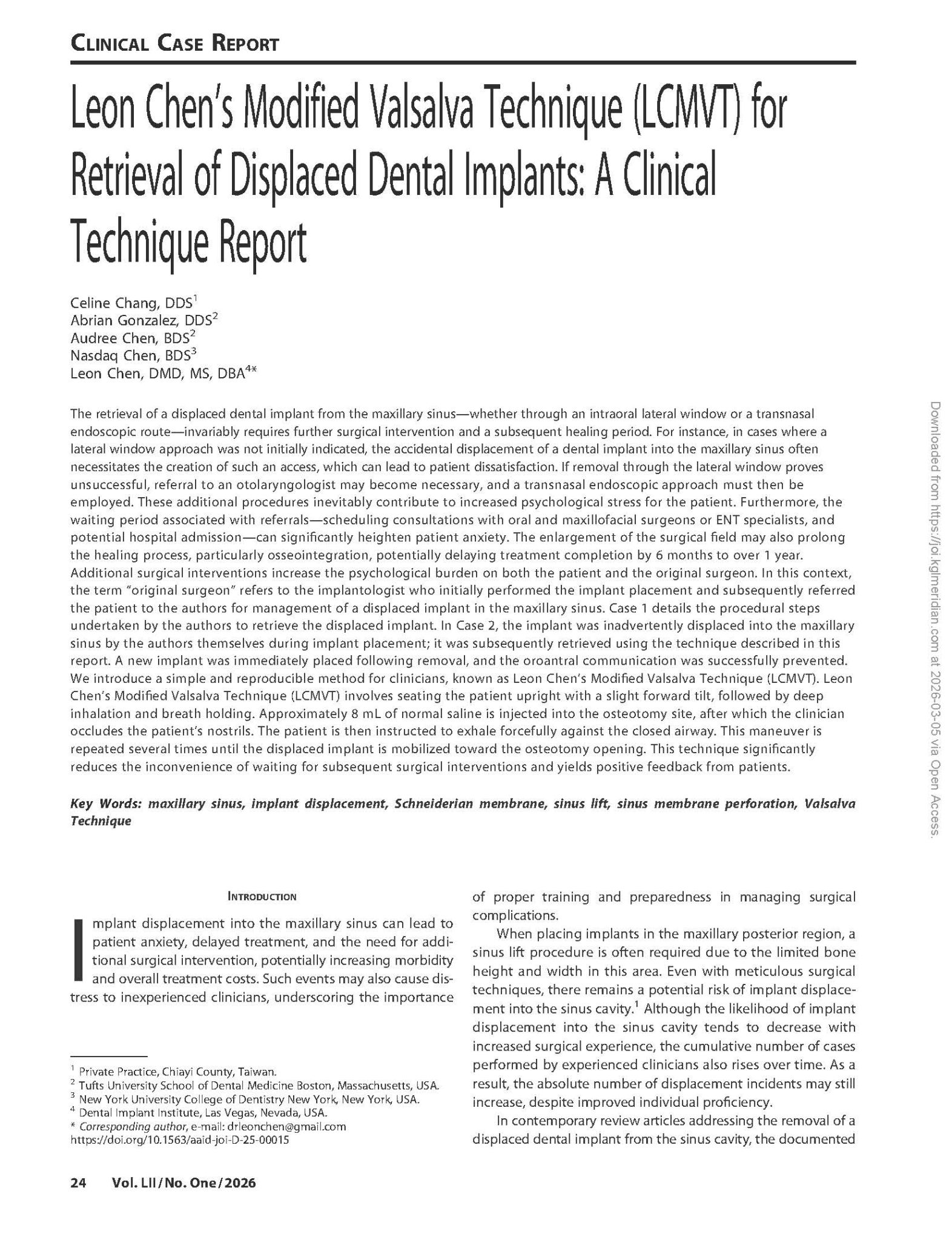 文章介紹 「Leon Chen 改良式瓦氏技巧」(LCMVT, Leon Chen Modified Valsalva Technique),這是一種用於處理植體不慎掉入上頜竇時的 微創、非侵入性取出方法。