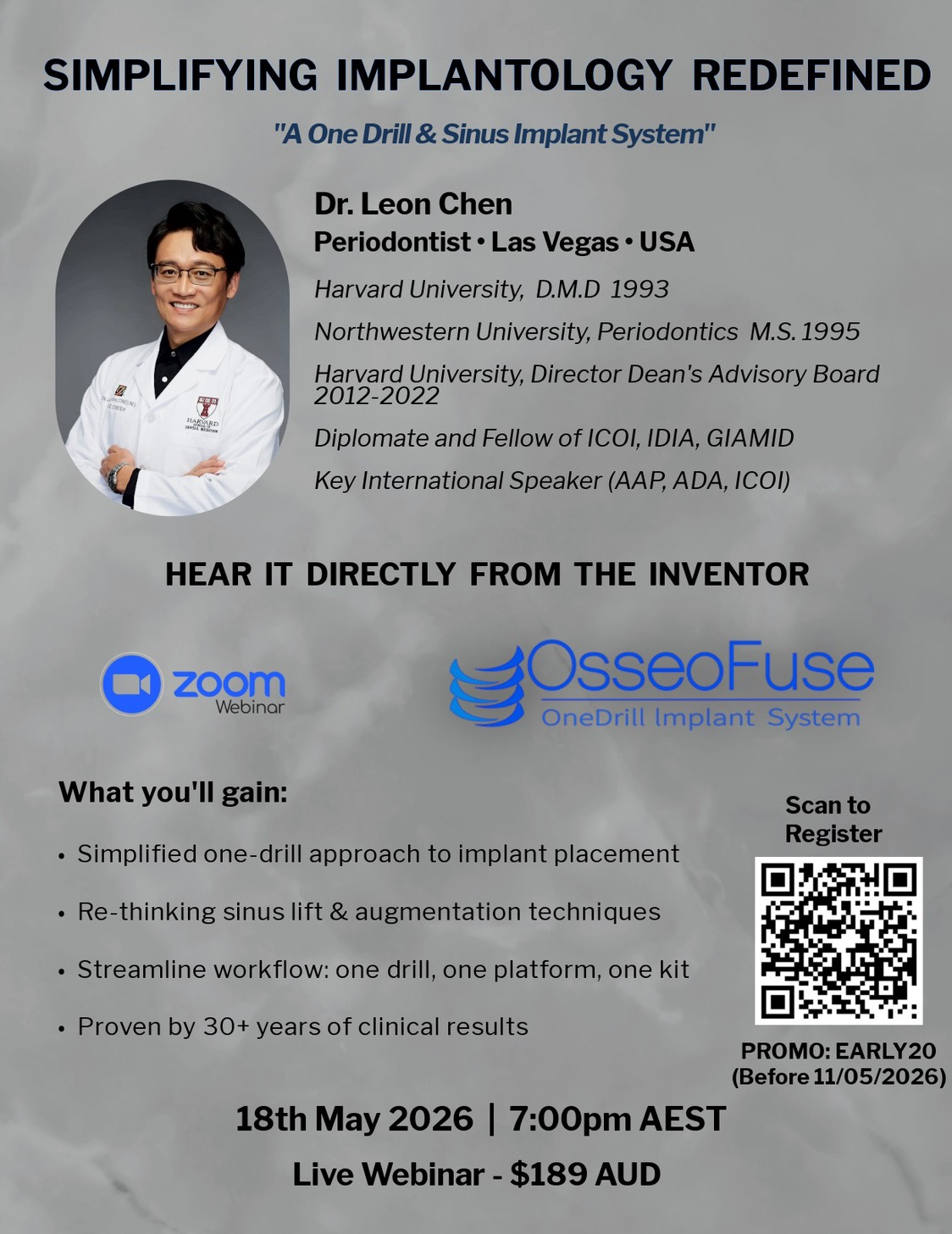 5/18(一)澳洲OsseoFuse舉辦針對「極簡植牙工法」的線上課程,與全球醫師分享如何透過技術革新,打破傳統繁瑣的手術框架。